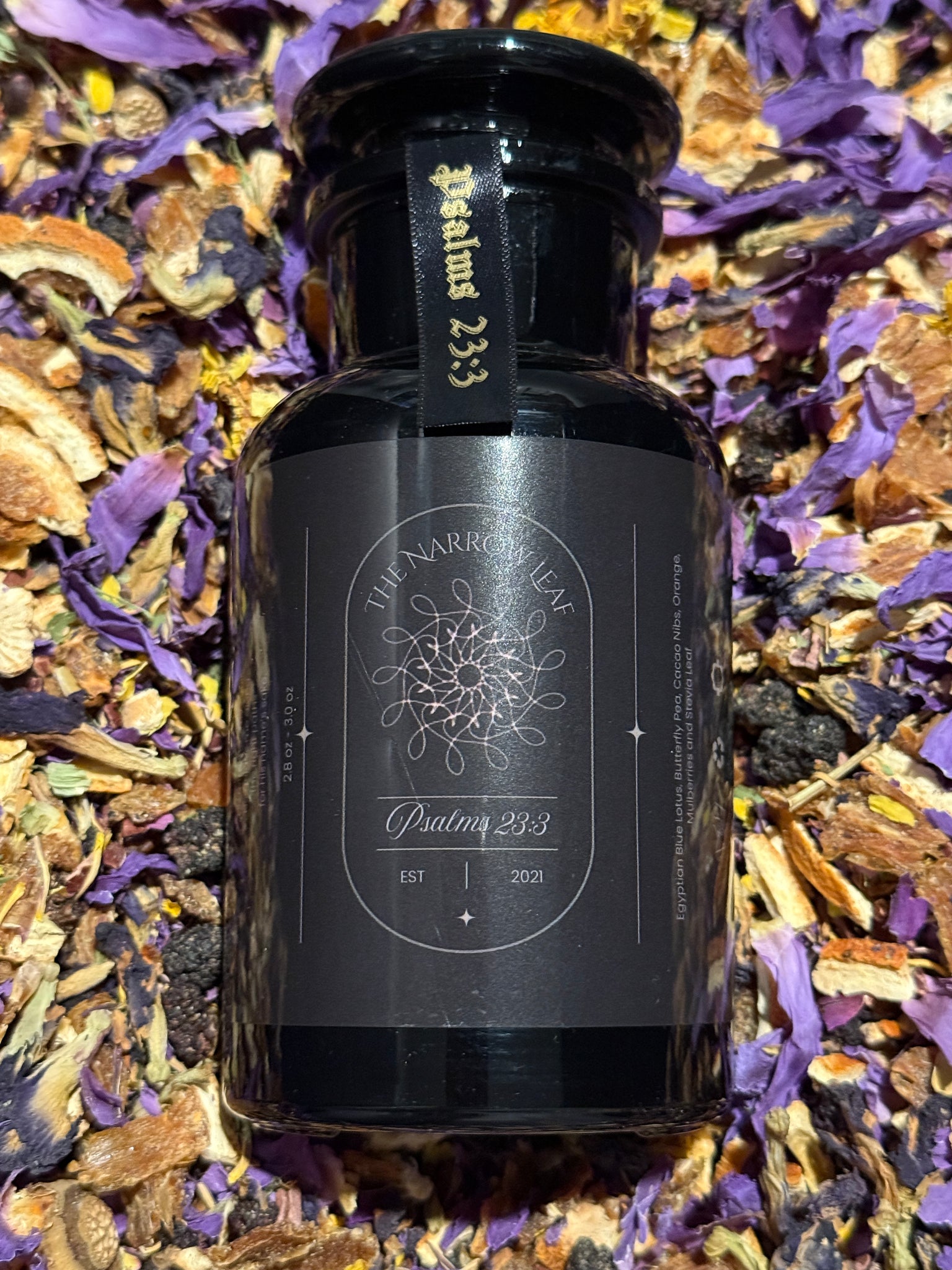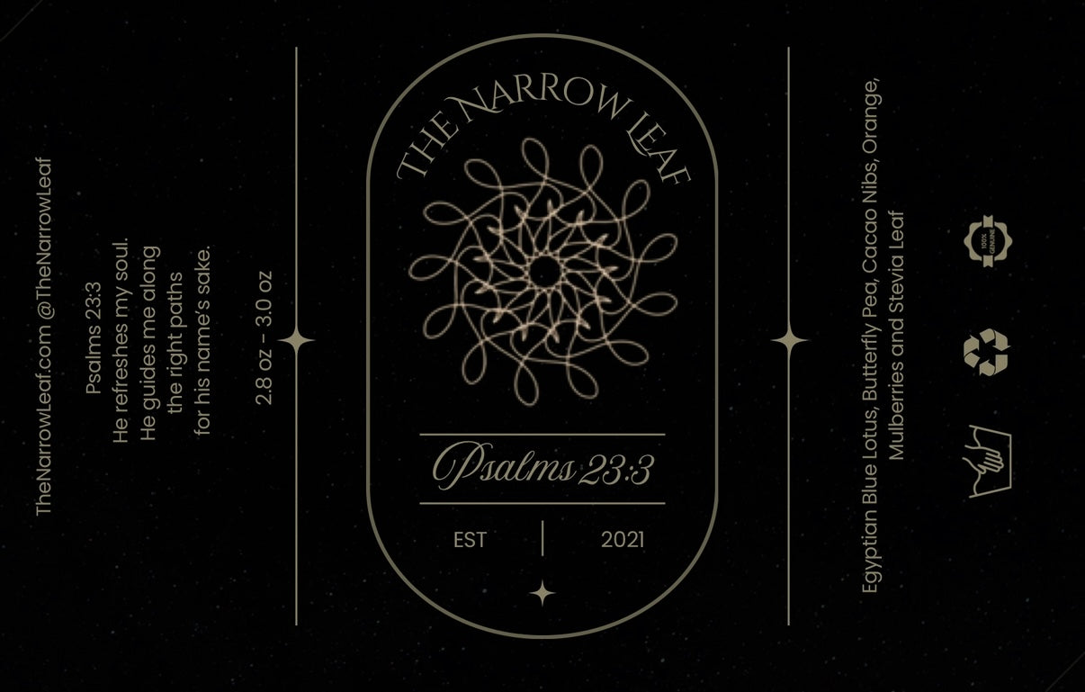 Egyptian blue lotus invites serenity and focus on His peace, while butterfly pea gives the tea its calming blue hue—a symbol of faith and divine guidance. Mulberries offer gentle sweetness, orange uplifts the spirit with light and joy, and cacao nibs add comforting warmth. Stevia leaf completes the blend, a reminder of the Lord’s tender kindness.