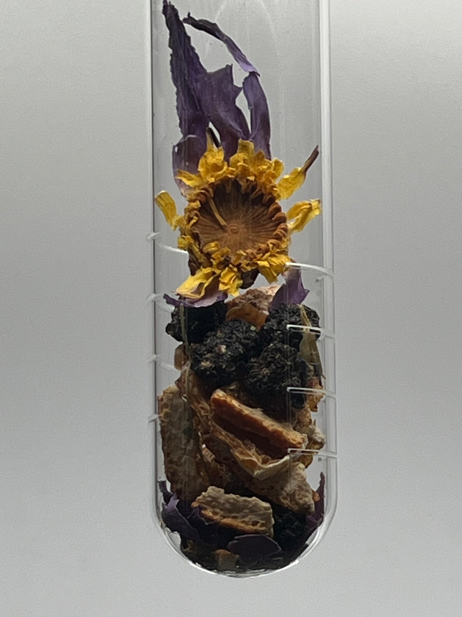Propriety Herbal ingredients: Caçao Nibs, Orange, Butterly Pea, Egyptian Blue Lotus, Mulberries and Stevia Leaf.